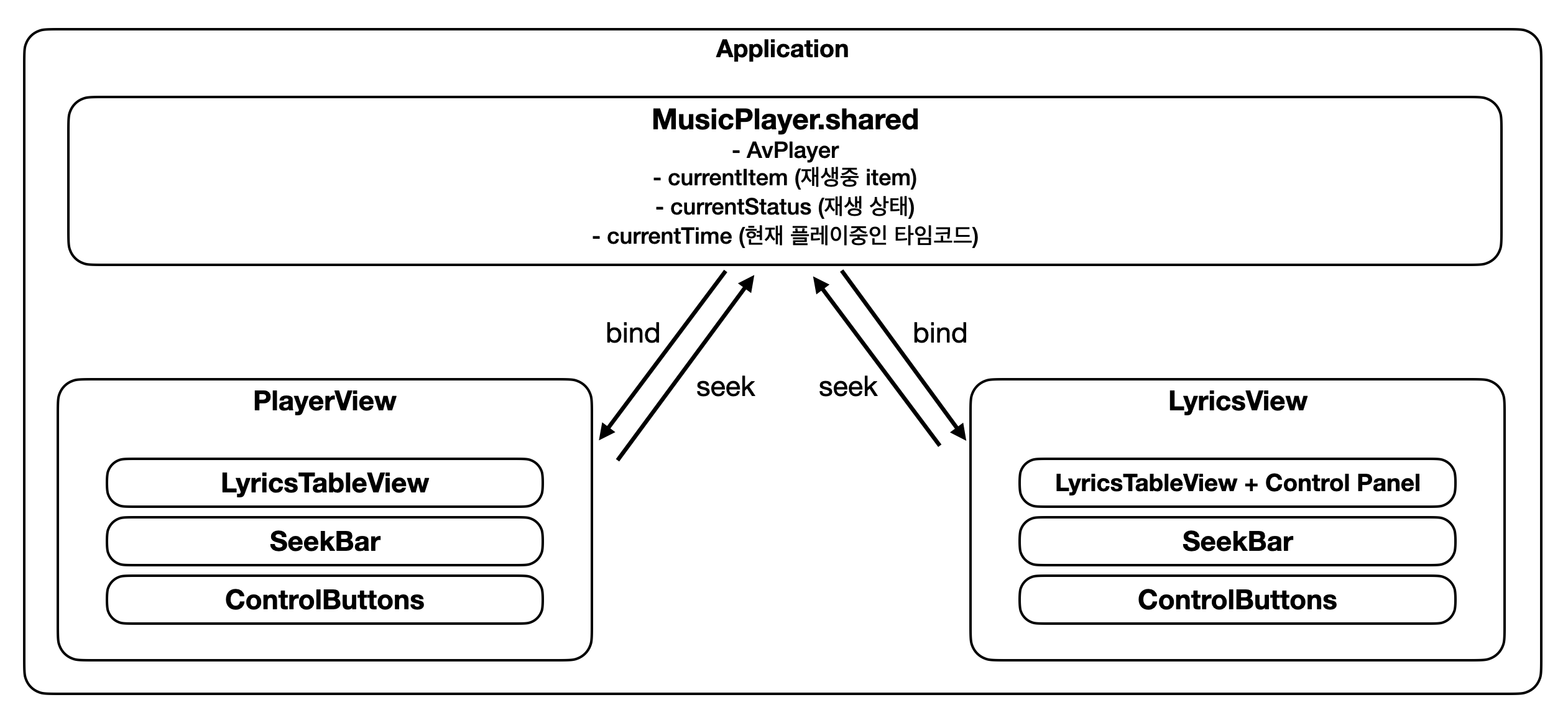 - 애플리케이션 아래에 앱의 핵심 기능인 MusicPlayer을 싱글톤으로 구현했다.