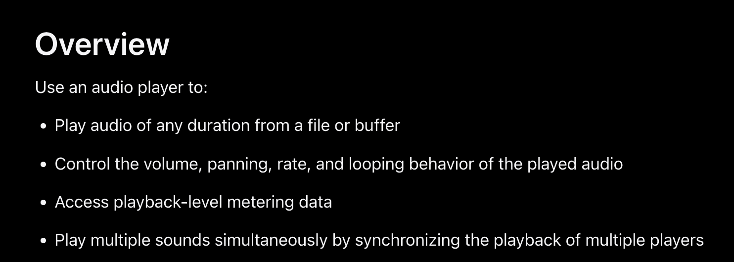 AVAudioPlayer는 'An object that plays audio data from a file or buffer' 라고 공식문서에서 설명하고 있다.